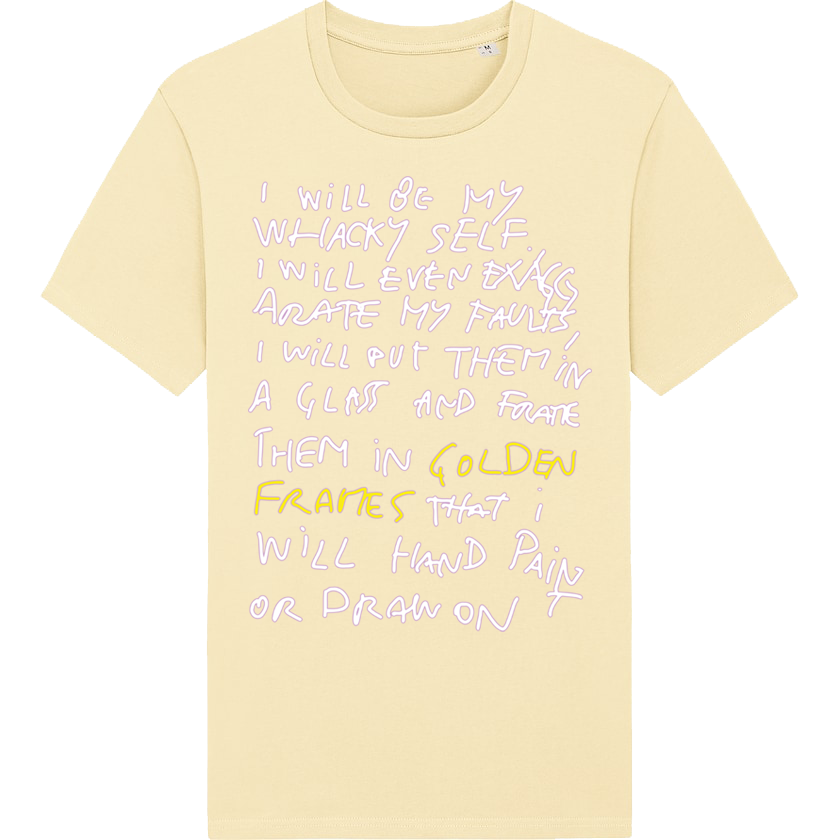 "I will be my whacky self, I will even exaggerate my faults, I will put them in golden frames and frames that I will hand paint and draw on them because I am not a neat person." Yes, I have just noticed the grammar issue. That's the exact thing I am talking about. It stays on the shirt.